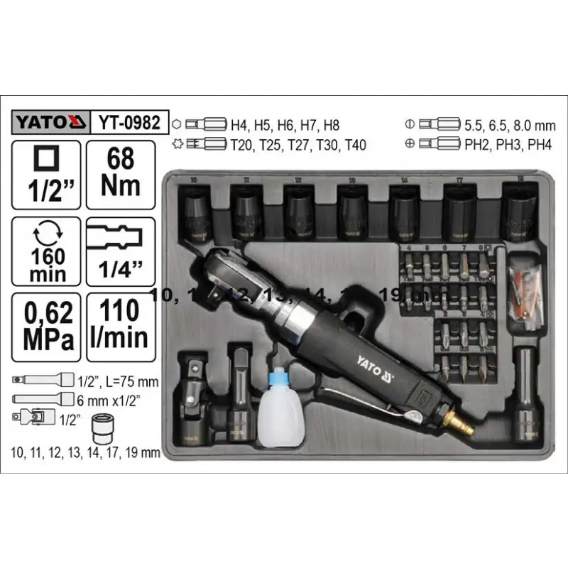 Spetsifikatsioonid BrandYato EAN2724299221295 KIRJELDUS: Narre-mutrikeeraja komplekt Heavy Duty Type 1/2 " 68Nm on vahend, mis kasutab suruõhku. See lihtsustab ja lühendab töö korda, pakkudes samuti usaldusväärset ja pikaajalist tööd.
