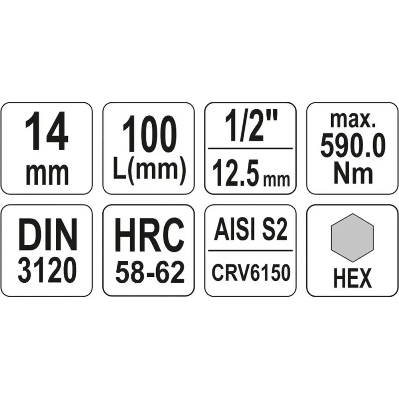 14mm kuuskant 1/2" padrun pikk L100mm YT-04397