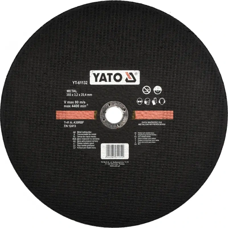 Corundum ketas metalli ja terase lõikamiseks. Kettaaugu läbimõõt 25,4 mm, plaadi läbimõõt 355 mm. Sobib YT-82180 lõikurile.