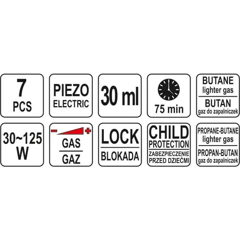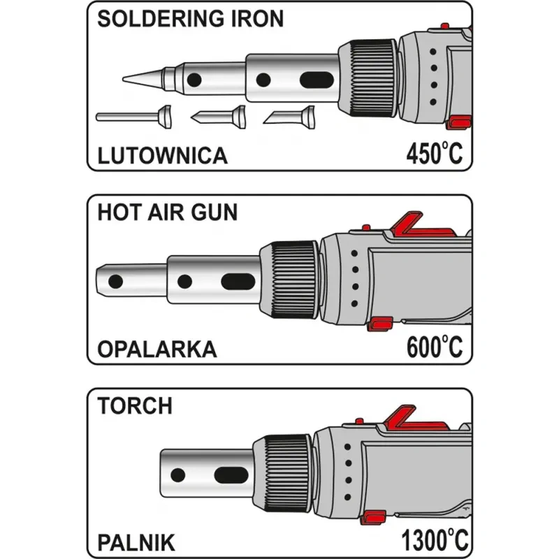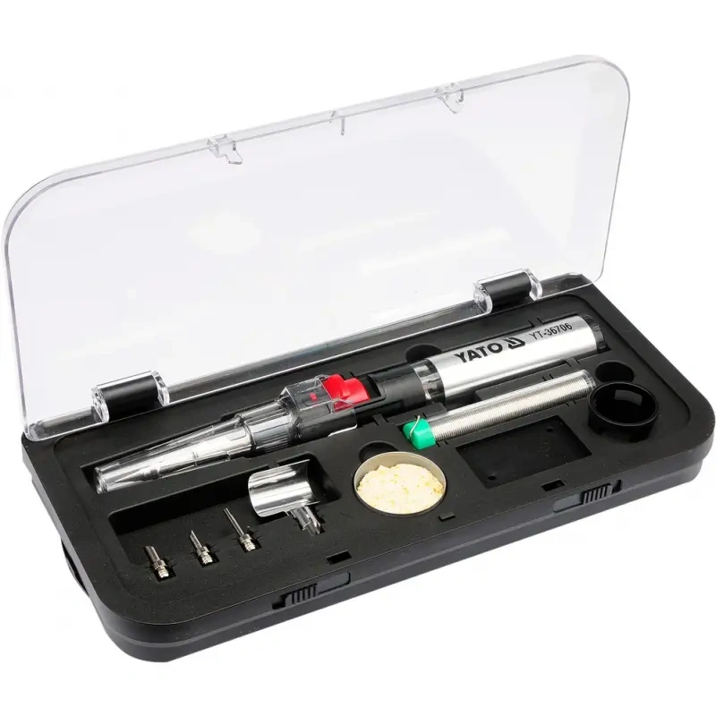3-in-1 komplekt mille toiteallikas on gaas - butaan võimsusega 30-125W. Sellel on jootekolvi funktsioon (max temp 450º C), kuumapüstoli funktsioon (max temp 600º C) ja põleti funktsioon (max temp 1300º C). Mahuti mahutavus on 30 ml, mis võimaldab teil töötada kuni 75 minutit. Kere ülevaatusaken võimaldab gaasi taset kontrollida. Komplekt sisaldab tina, käsna, 4 erinevat nippi ja düüsi. Lisaks sellele on spetsiaalses kastis funktsioon mobiilse tööjaama moodustamiseks jootekolvi ja tina jaoks. Põleti on ette nähtud tina jootmiseks, pürograafiaks (põletamine puidu abil), termokahanevate materjalide parkimiseks või vähendamiseks. Põletit saab kasutada Cu torude jootmiseks, kinnituskruvide lahtivõtmiseks, keevitamiseks või sulatamiseks ning painutamiseks ja sooja moodustamiseks.