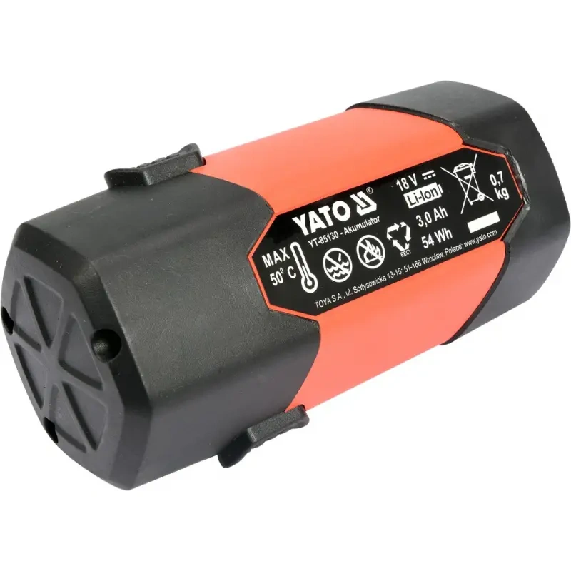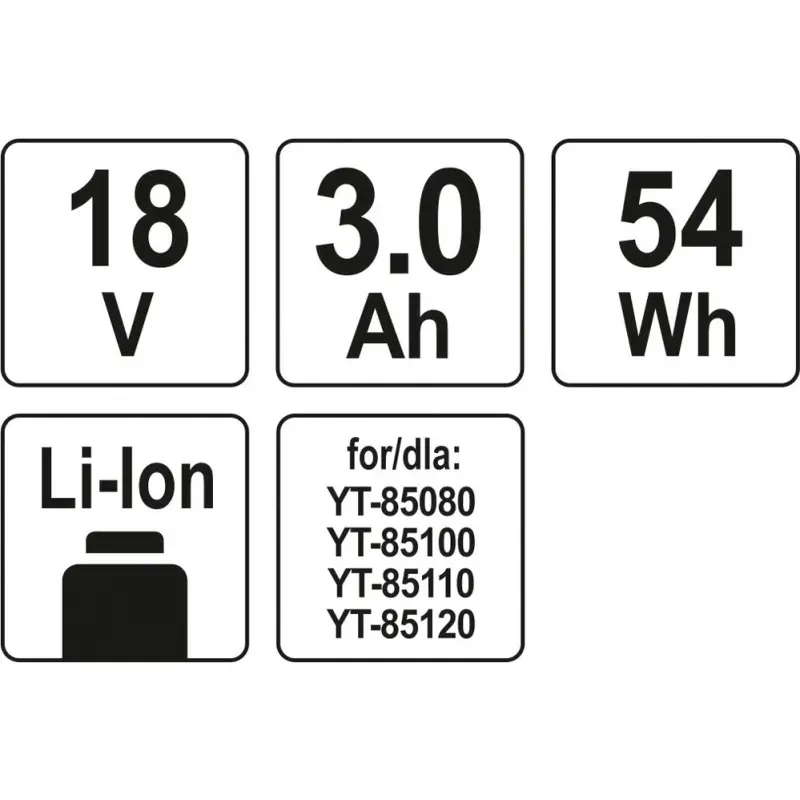 Aku Li-Ion 18V / 3,0Ahsobib toodeteleYT-85080, YT-85100, YT-85110, YT-85120 ja ühildub laadijaga YT-85131.