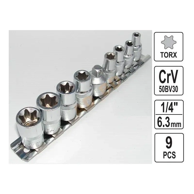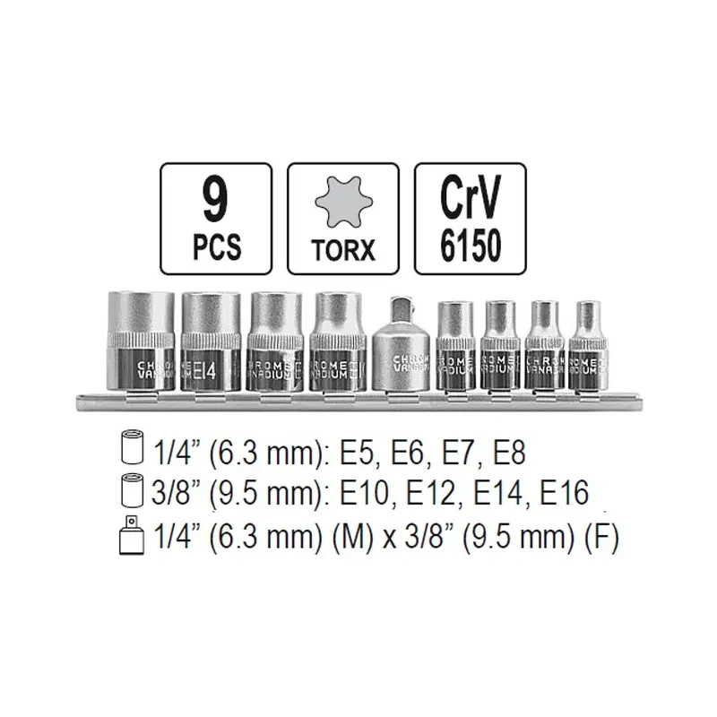 Spetsiaalne torx mütsid, mida kasutatakse autotööstuses, mehaanikates ja elektroonikas. Mütsid on valmistatud CrV 6150 kroom-vanadioni terasest, mis tagab nende vastupidavuse ja pika eluea. Komplekti kuulub ka mütsid, mis töötavad YATO põrkmehhanismidega.