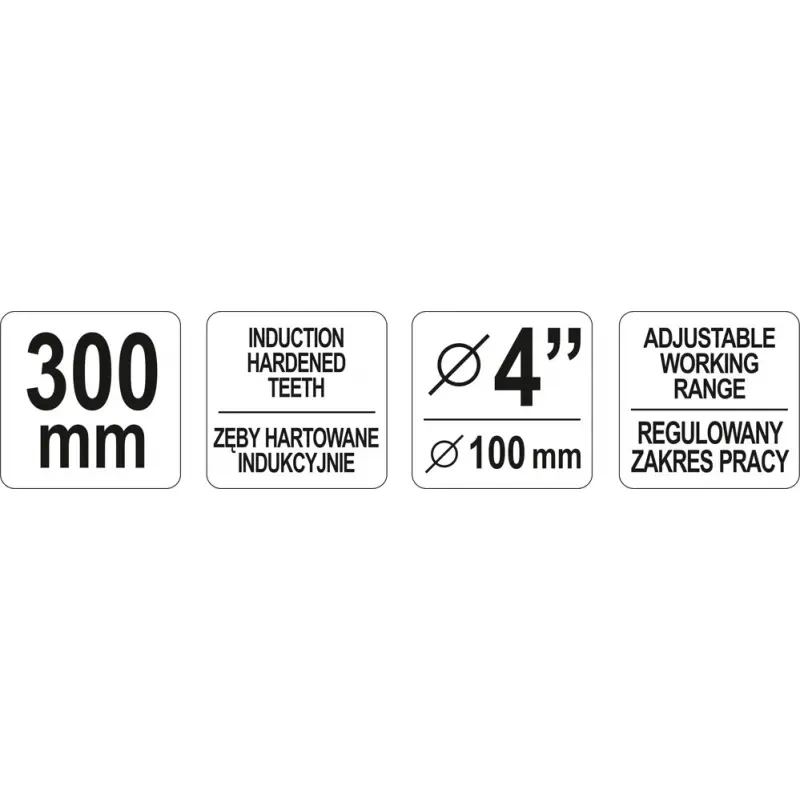Toru mutter. Klahvi pikkus on 300 mm. Keti pikkus 400mm, Max toru läbimõõt: 4 "/ 100mm, reguleeritav töövahemik. Induktsioonist kõvenenud hambad