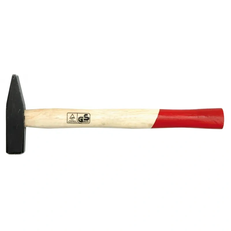 Terasest haamer, mis on paigaldatud puidust käepidemest. Värvitud käepide. Hammeri pind on mustane. Ühendus on kinnitatud kiiludega.