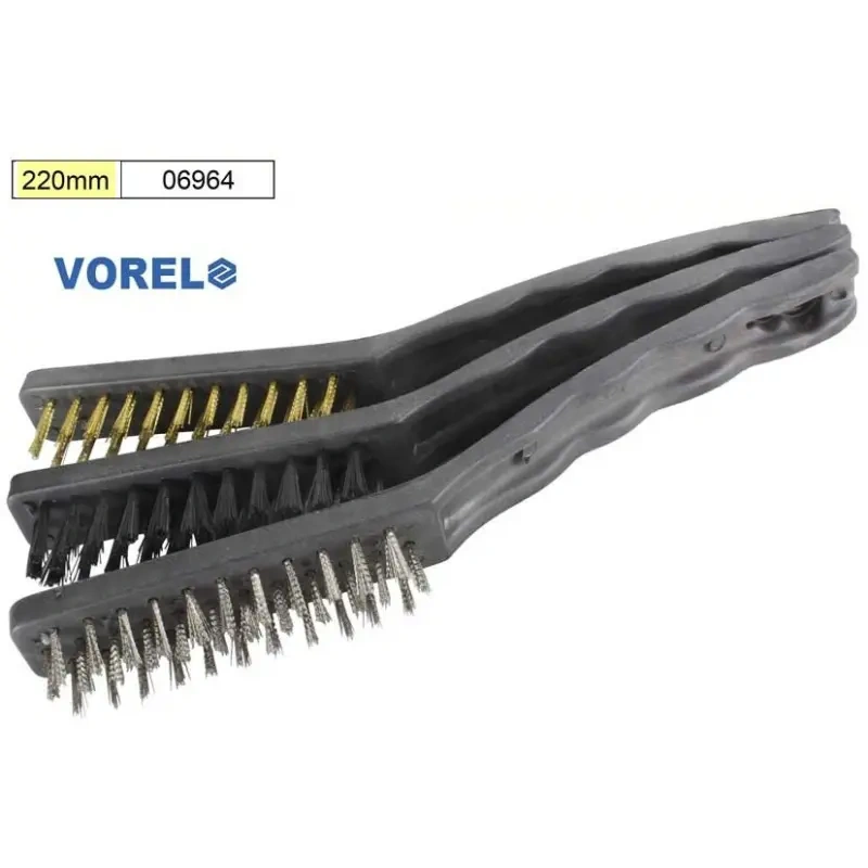 Kolme tehnilise harjaga, mis on valmistatud galvaniseeritud terastraadist, messingist ja nailonist. Karestatud pintsli korpused. Pikkus 230 mm