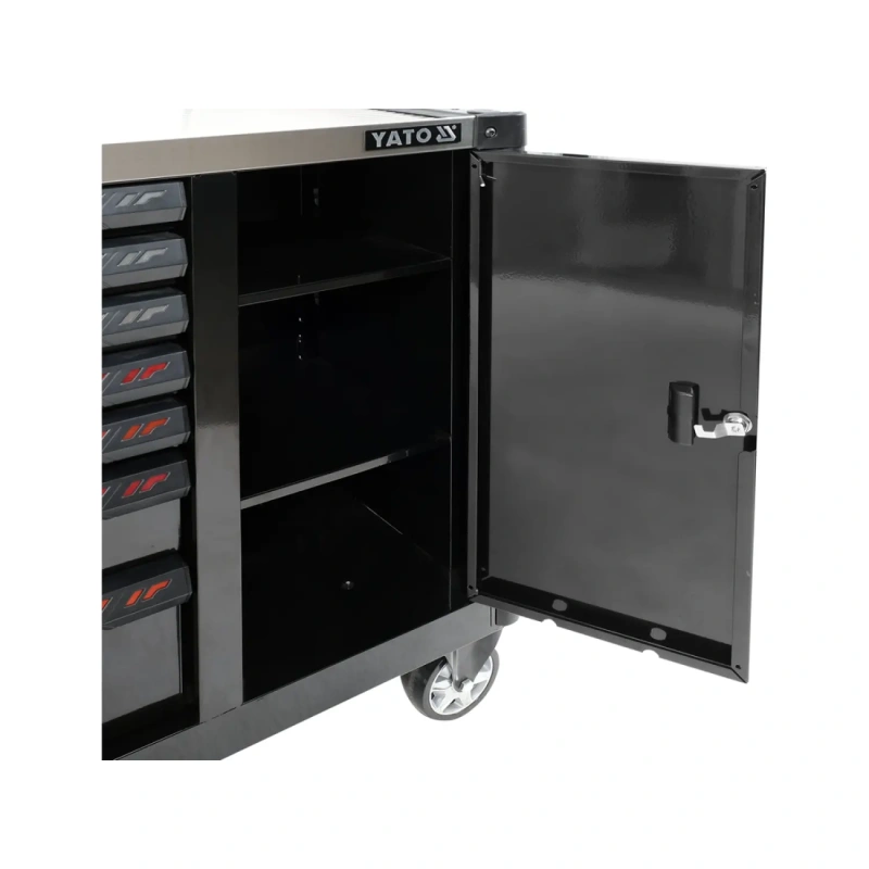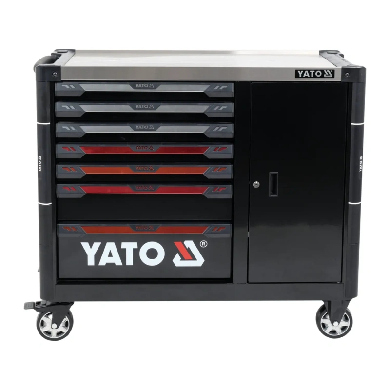 Uus YATO YT-09033 hooldustööriistakapp on ainulaadne disain, mille mehhanism takistab samaaegselt rohkem kui ühe sahtli avamist. Kõik sahtlid toimivad sujuvalt tänu spetsiaalsete juhikute ja kuulkandurite kasutamisele. Kogu üksus on lukustatud kesklukuga.
