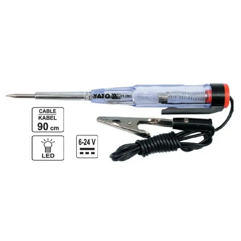 LED dioodiga varustatud auto pinge tester. Mõõteulatus on 6 V kuni 24 V. Kaabli pikkus 90 cm. Kaabli otsas "krokodill".