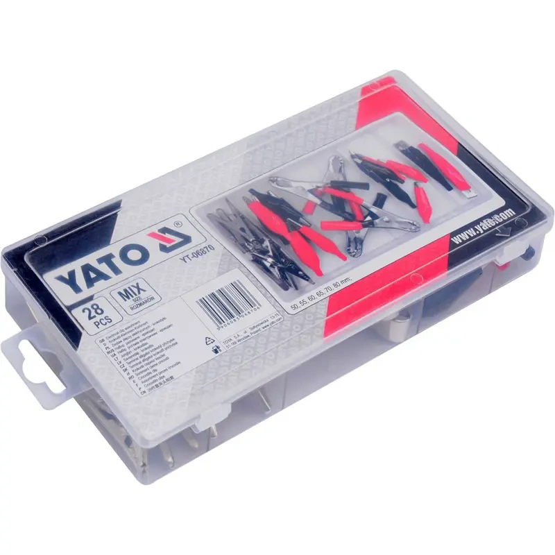 Elektriliste krokodillide komplekt. Pakendis on 28 erineva suurusega krokodillklippe, isoleeritud ja mitte isoleeritud. Kogu asetati sobivasse sorteerimisliiki.