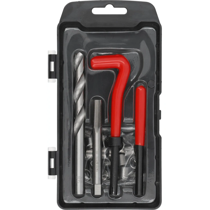 - Komplekti sisu: üheastmeline uuele sisetükile keerme tegemiseks, spiraalsisestus x25 (M10x1,0), nupp spiraalsete vahetükkide sissekeeramiseks, stants, puur kahjustatud keerme hõõrimiseks,