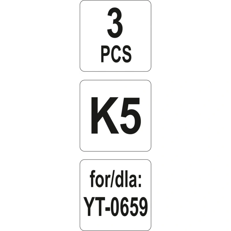 Komplekt sisaldab kolme erineva profiiliga tera, mis on valmistatud terasest sümboliga K5.