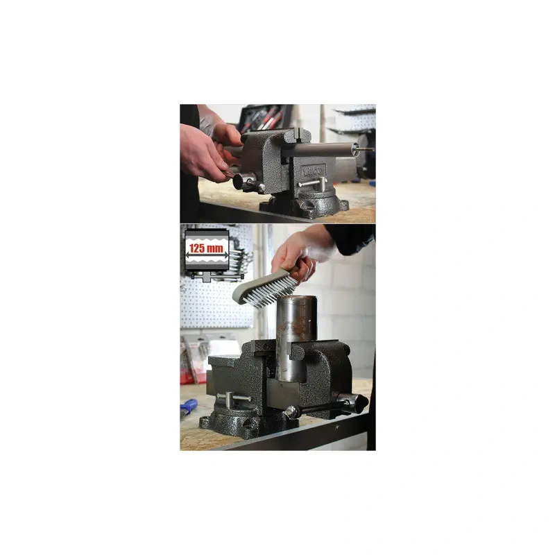 Halli malmist valmistatud visekest, 125 mm vahelduvad asendid ja karastatud terasest alaosa. Trapetsiaalse profiiliga niidiga tõmbekruvi on täielikult kaitstud. Vise paigaldatakse pöördlauale. Musta "vasara" lakiga kaetud pind.