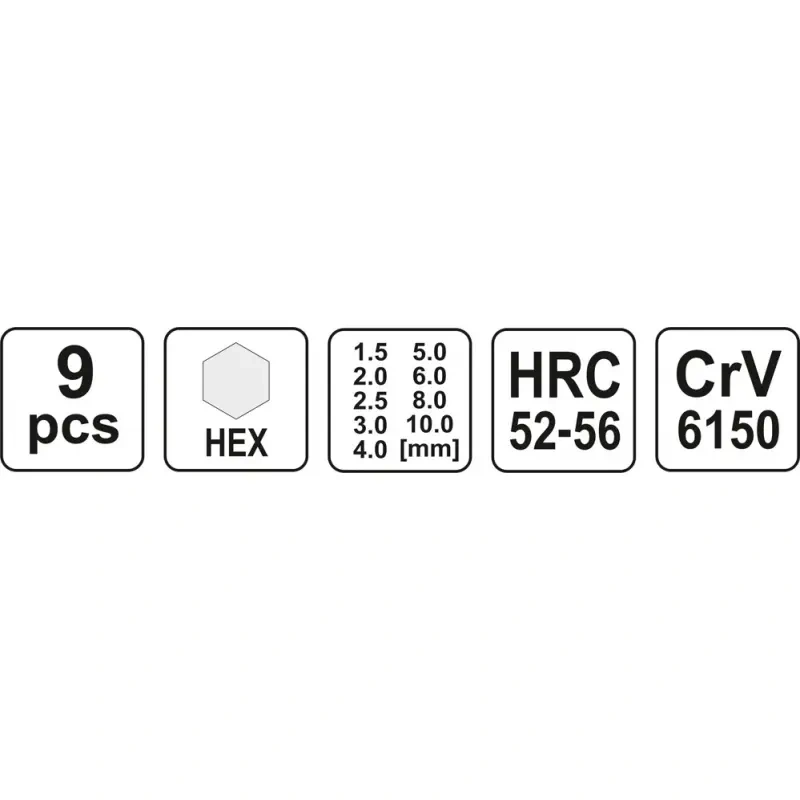 Kuuskantvõtmete professionaalne komplekt. Komplekt on pakendatud praktilise ja käepärase plastmärgisega, mis muudab õige võtme suuruse leidmise lihtsaks. Võtmed on valmistatud kõrgekvaliteetsest CrV 6150 kroomitud vanaadiumterasest, mida iseloomustab vastupidavus ja elastsus. Allenese karedus on 52-55 HRC.