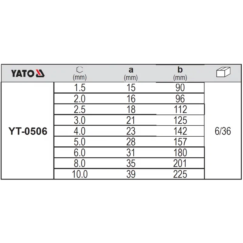 Professionaalne komplekt YATO Allen-mutrivõtmed hex-otsaga. Komplekt pakitakse praktilise plastmassist sildi, mis muudab õige võtme suuruse leidmise lihtsaks. Võtmed on valmistatud kõrgekvaliteetsest CrV 6150 kroomitud vanaadiumterasest, mida iseloomustab vastupidavus ja elastsus. Allenese karedus on 52-55 HRC.