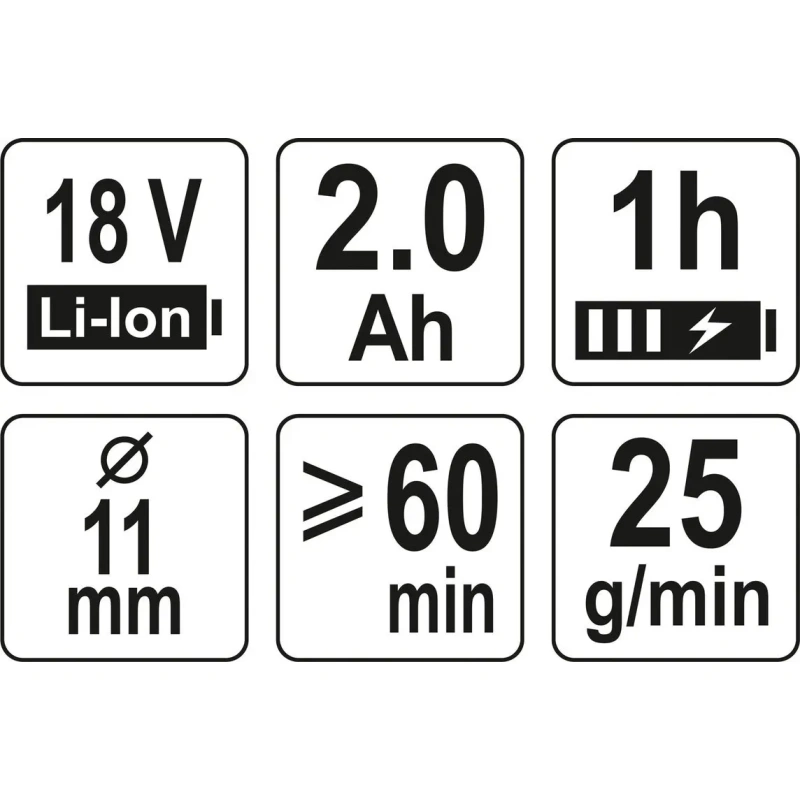 - saadaval olevad varupatareid: 2 Ah ( YT-82842 ), 3 Ah ( YT-82843 ), 4 Ah ( YT-82844 ) ja 6 Ah ( YT-82845 )
