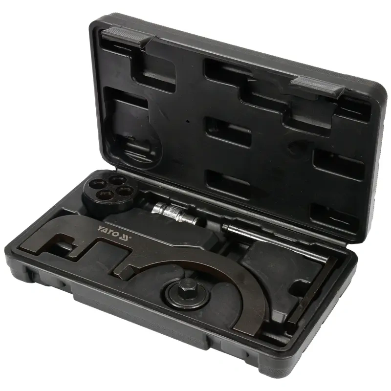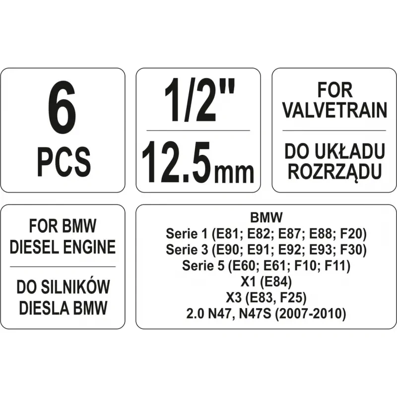 VASTAVAD BMW DISAINIMOOTORIGA MOOTORI KOODIDEGA N47, N47S, N57, N57S; JÄRGMISED MOODULID: 116D 118D 120D 123D, TÜÜP E81 E82 E87 E88 F20, 316D 318D 320D 325D 330D TÜÜP E90 E91 E92 E93 F30, 520D 525D 530D 530D GT 535D 535D GT M550D, TÜÜP E60 E61 F07 F10 F11, 640D TÜÜP F12, 730D 740D 750D, TYPE F01, X1 1.8D 2.0D 2.3D, TÜÜP E84, X3 1.8D 2.0D 3.0D, 3.5D TÜÜP E83 F25, X5 3.0D 4.0D M5.0D, TÜÜP E70, X6 3.0D 4.0D M5. 0D, TÜÜP E71; SEALHULGAS järgmised vahendid: kerevõlli keeramise tööriist, mida kasutatakse kui OEM 116480; CAMSHAFT LOCKING TOOL, mida kasutatakse kui OEM 118760; PUMP-SPROCKET SUPPORT SLEEVE, mida kasutatakse kui OEM 118740/118741; CRANKSHAFT PULLEY LOCKING TOOL, mida kasutatakse kui OEM 115320