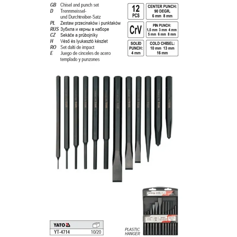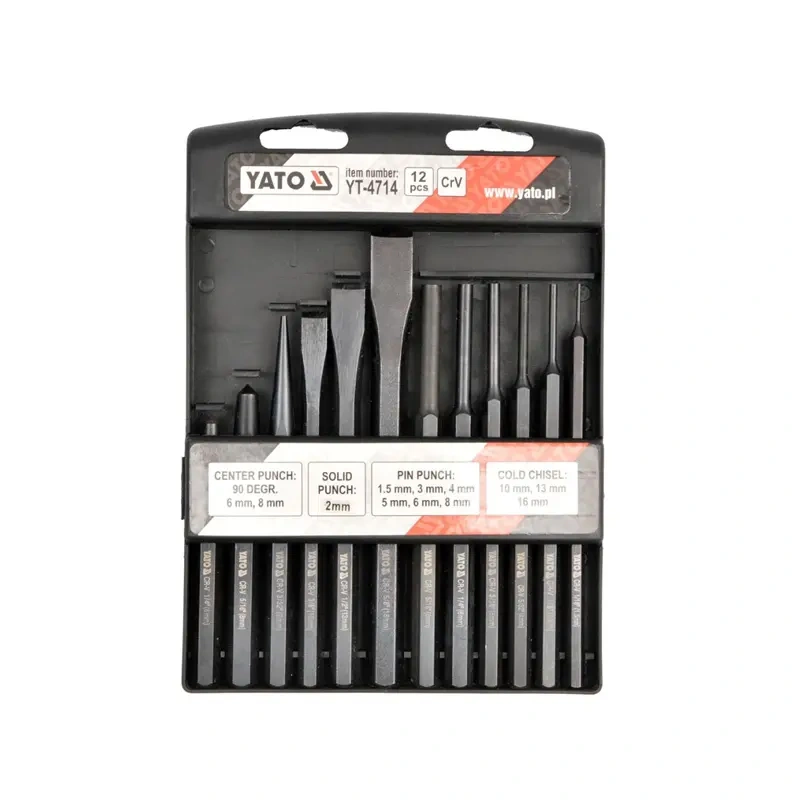 Yato YT-4714 mugav metallitöökomplekt metalliga töötamiseks. 6 augustajat võimaldavad toorikutelt välja lüüa vanad needid, puksid ja muud silindrilised sisetükid.