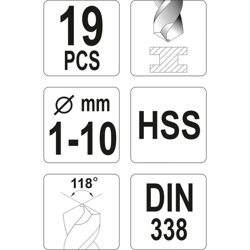 Metallipuurid 19tk 1-10mm HSS DIN338 must YT-4462