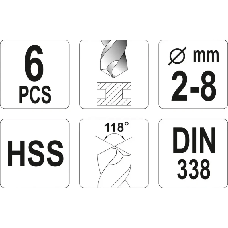 Metallipuurid 6tk kompl2-8mm HSS DIN338 must YT-4460