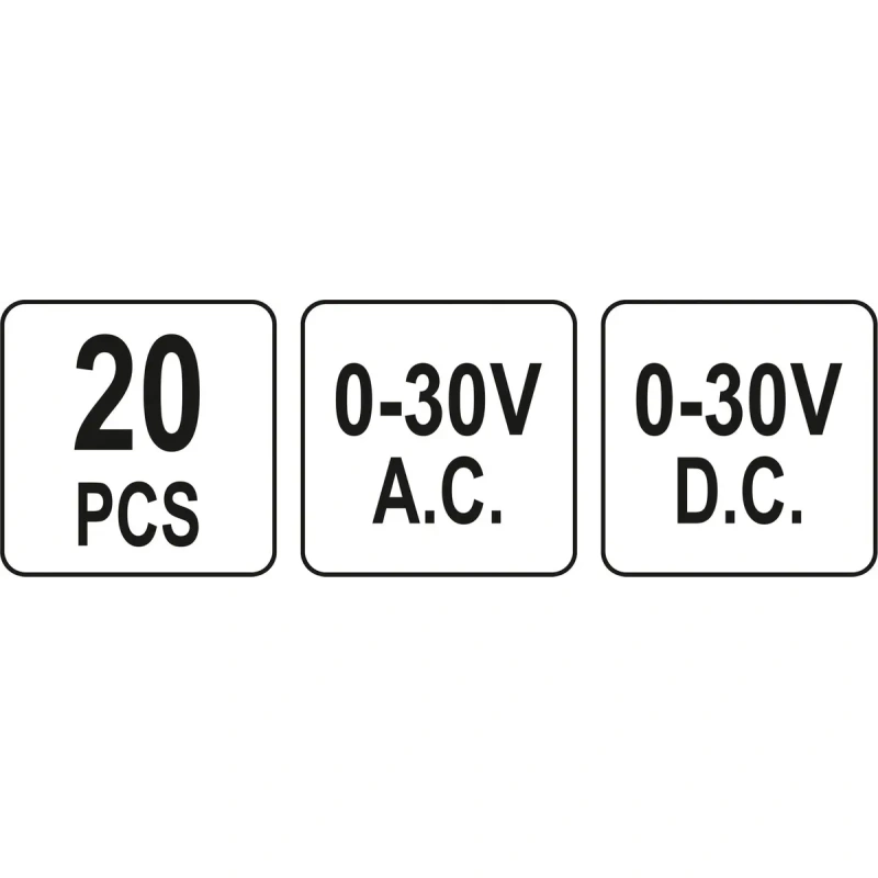 Multimeetrite mõõteelementide komplekt. Sobib suurepäraselt sõidu- ja veoautode elektripaigaldiste kiireks testimiseks. Mugavalt pakitud 20 esemega, mis sobivad enamiku saadaolevate multimeetritega.