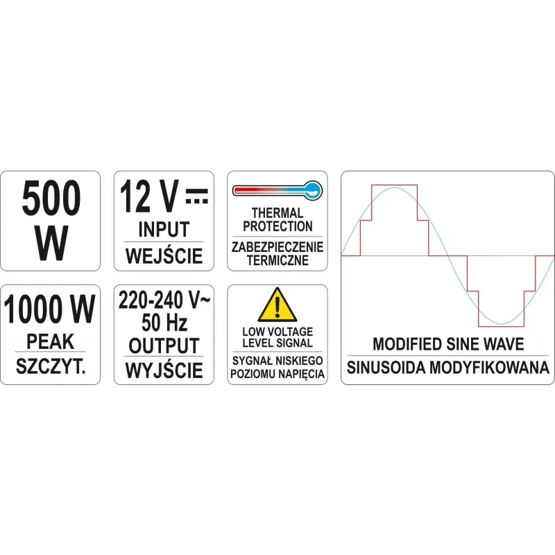 Pinge muundurit YT-81490 12V / 230V-240V 500W kasutatakse elektriseadmete varustamiseks, mis vajavad 230 V vahelduvpinget akumulaatoritest ja pidevat pinget 12V. Inverterid sobivad ideaalselt kohtadesse, kus puudub võimalus otsest ühendust elektrivõrguga.