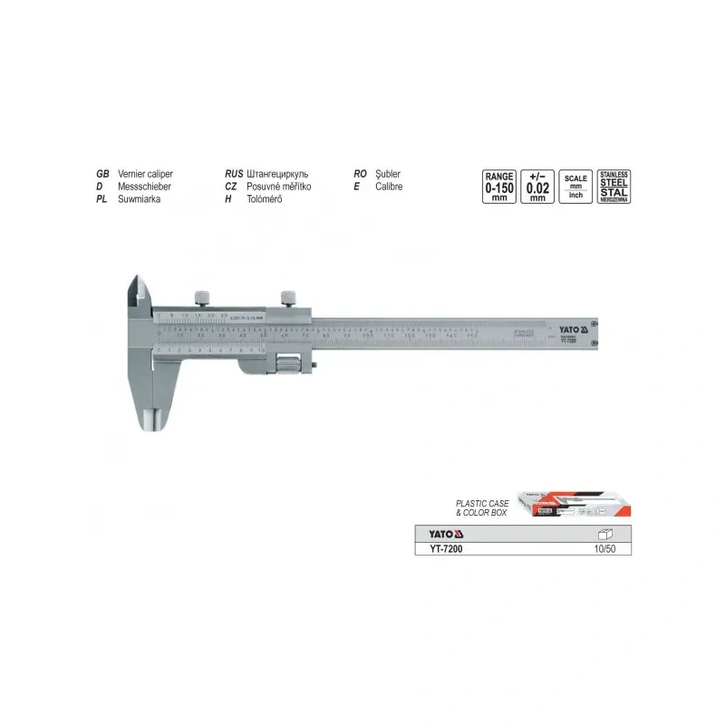 Roostevabast terasest valmistatud klassikaline kallet mõõdab vahemikus 0-150 mm. täpsusega 0,02 mm. Selge ja loetav skaala mõjutab kuvatud väärtuste täpsust ja loetavust. Kogu on paigutatud vastupidavasse ja mugavasse pakendisse. Võimaldab väliseid, sisemisi mõõtmisi, kõrgus ja sügavusemõõtmisi.