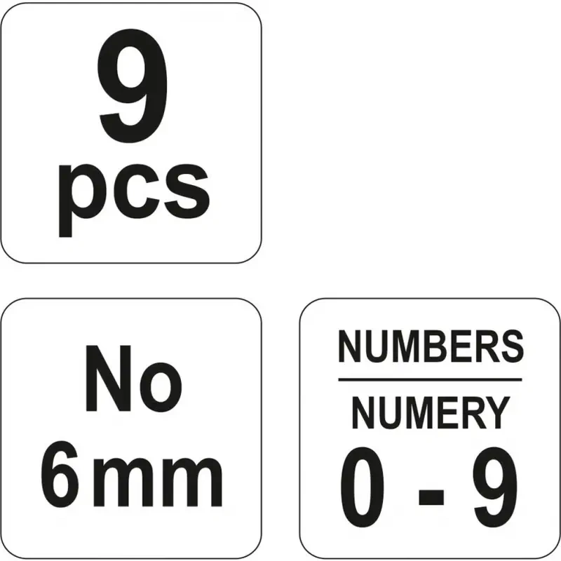 Tehtud 1045CS süsinikusisaldusega terasest, karastatud u. 50-55 HRC. Stantse ristküliku kõrgusega 66 mm ja pool 8 mm, numbri kõrgus on 6 mm. Komplekt kogutud plastmahutisse, sisaldab järgmisi numbrid 0, 1, 2, 3, 4, 5, 6, 7, 8 mm. Kohaline 9 saadakse peegeldades vastassuunas number kuut.