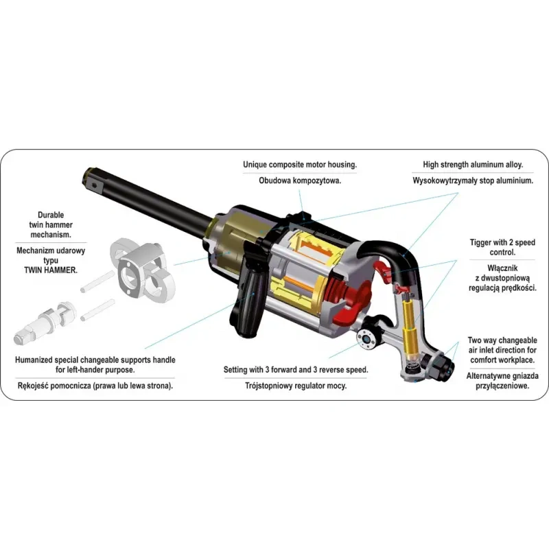 Professionalne pneumaatilise löökmutrivõti mõeldud raskeveokite, tööstuslike ja mootorsõidukite jaoks. Ultralight võti 1 ", mille võimsus on 2700 Nm. Komposiit magneesiumi-ehitus mehhanismi kahe haamriga, madal õhu tarbimine võimaldab teil töötada mobiilselt. Kaal 8,3 kg. Õhukulu 255 l / min .