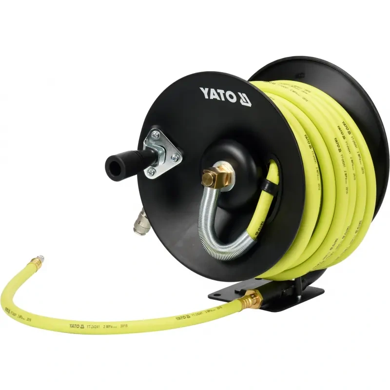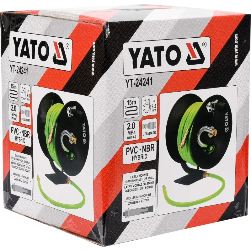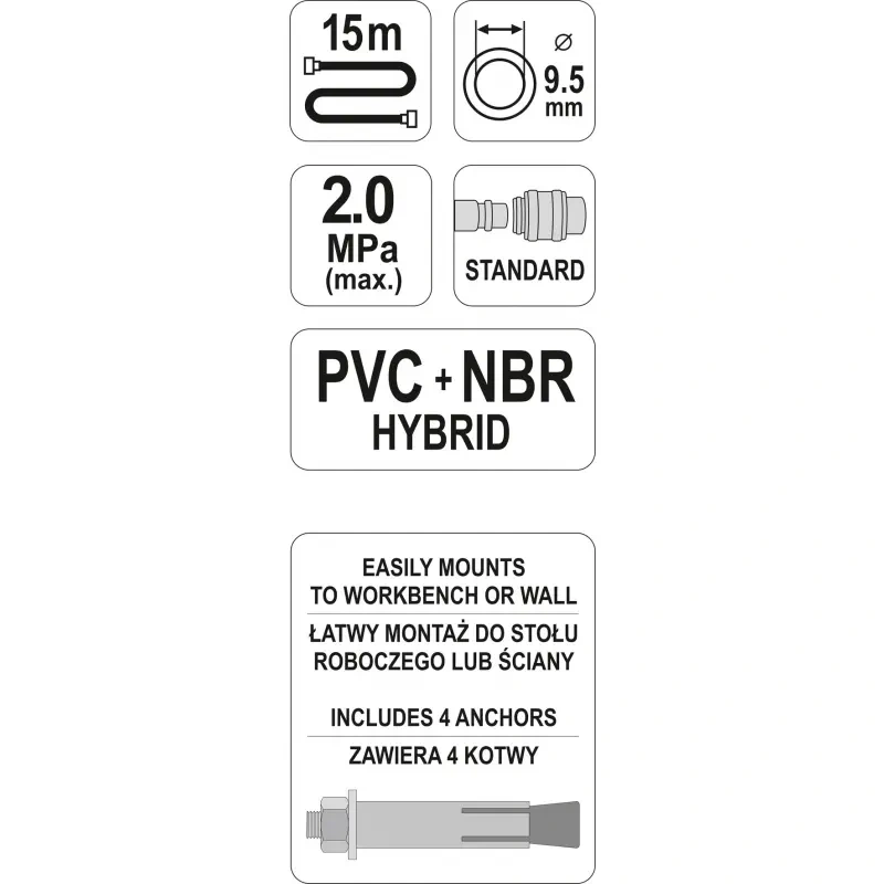 HYBRID pneumaatiline voolik, pikkus 15m - ühendus pikkus 60cm. Seda saab paigaldada seinale või põrandale. Voolik on kaetud standardsete kiirühendustega.