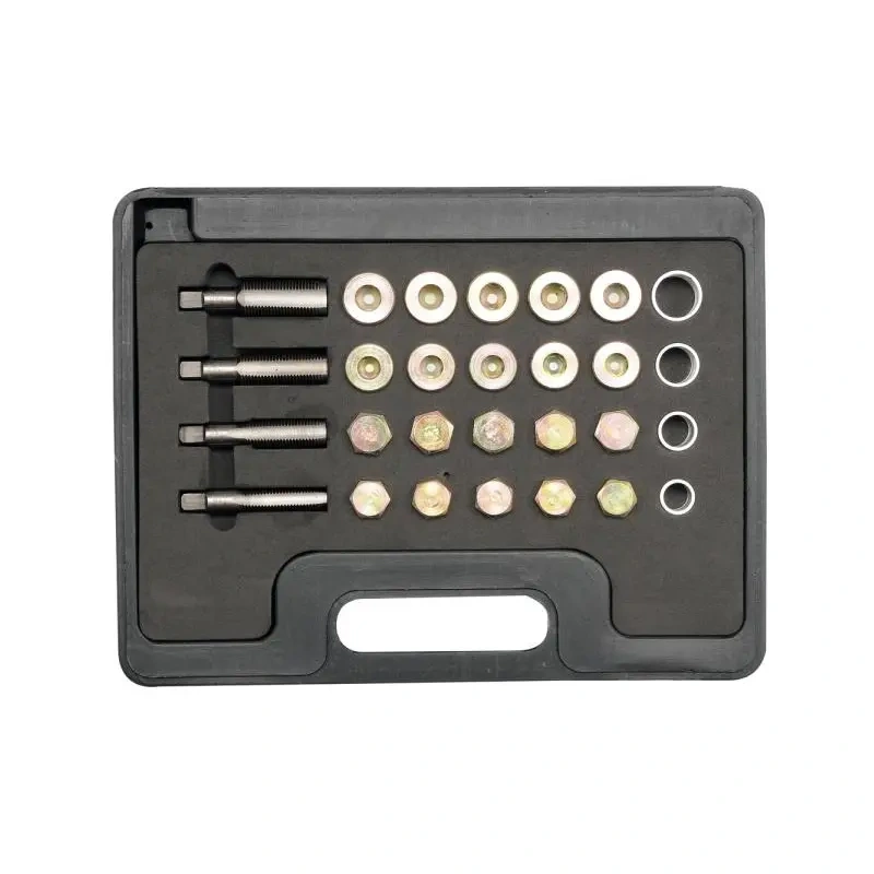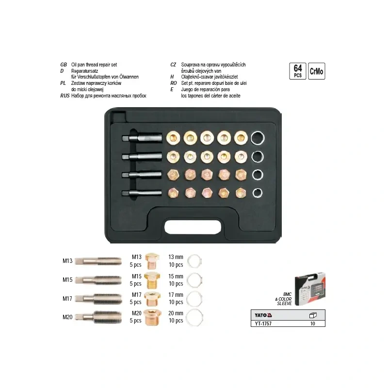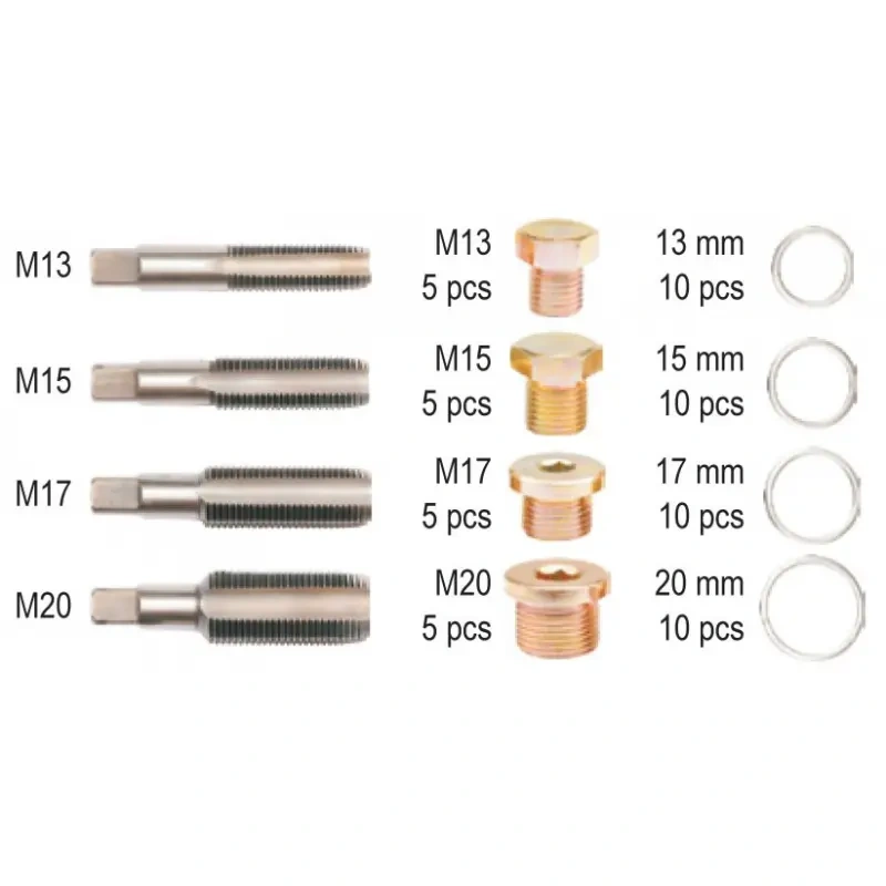 Remondikomplekt Yato õlijahuti korgitele. Kavandatud kahjustatud õluklappide parandamiseks. Komplekt on mõeldud nelja tüüpi niidid: M13, M15, M17, M20. HSS terasest valmistatud ühekordse keermega kraanid igas suuruses 5 tükki õliküpsettide jaoks ja 10 seibid. Pärast õlipumba lõime keermestamist tuleb seadmesse pistikupesa paigaldada. Komplekt kasutamiseks mehaaniliste, lukustamis- ja autoteeninduses.