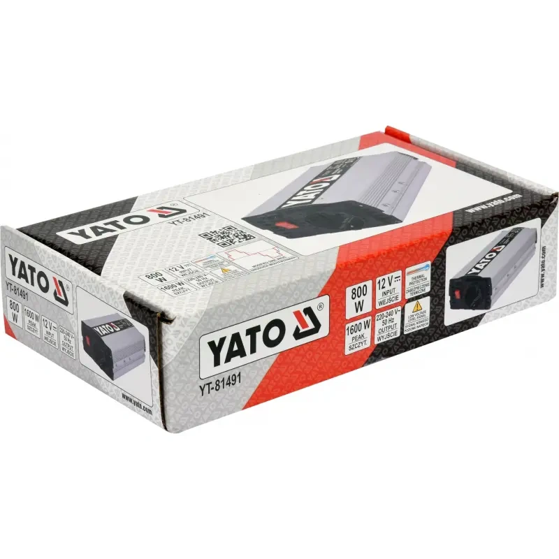 Pingemuundurit YT-81491 12V / 230V-240V 800W kasutatakse 230 V vahelduvpinget vajavate elektriseadmete toiteks akudest ja 12 V alalispingega mootorsõidukite paigaldistest. Muundurid sobivad ideaalselt kohtadesse, kus pole võimalik otse elektrivõrku ühendada.