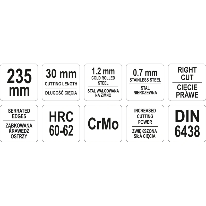 Professionaalsed, käsitsi käärid lehtmetalli lõikamiseks. Chrome-molübdeenilõikurid / CrMo /, kõvendatud ligikaudu 60-62 HRC-ni. Teraslehtede lõikamiseks kuni 1,2 mm paksuse ja roostevabast terasest kuni 0,7 mm paksune. Kogupikkus 235 mm. Profiil - RAW