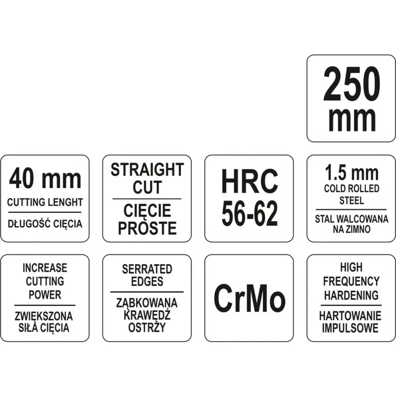 Käärid kroomitud molübdeenterasest sepistatud lehtmetalli lõikamiseks. Induktsiooniga karastatud keha kuni umbes 46-52 HRC ja lõiketangid kuni 56-62 HRC. See võimaldab kuni 1,5 mm paksuste teraslehtede vaba lõikamist Kääride käepidemed on kaetud plastkattega, oksüdeeritud, must pind. Kogupikkus 250 mm.