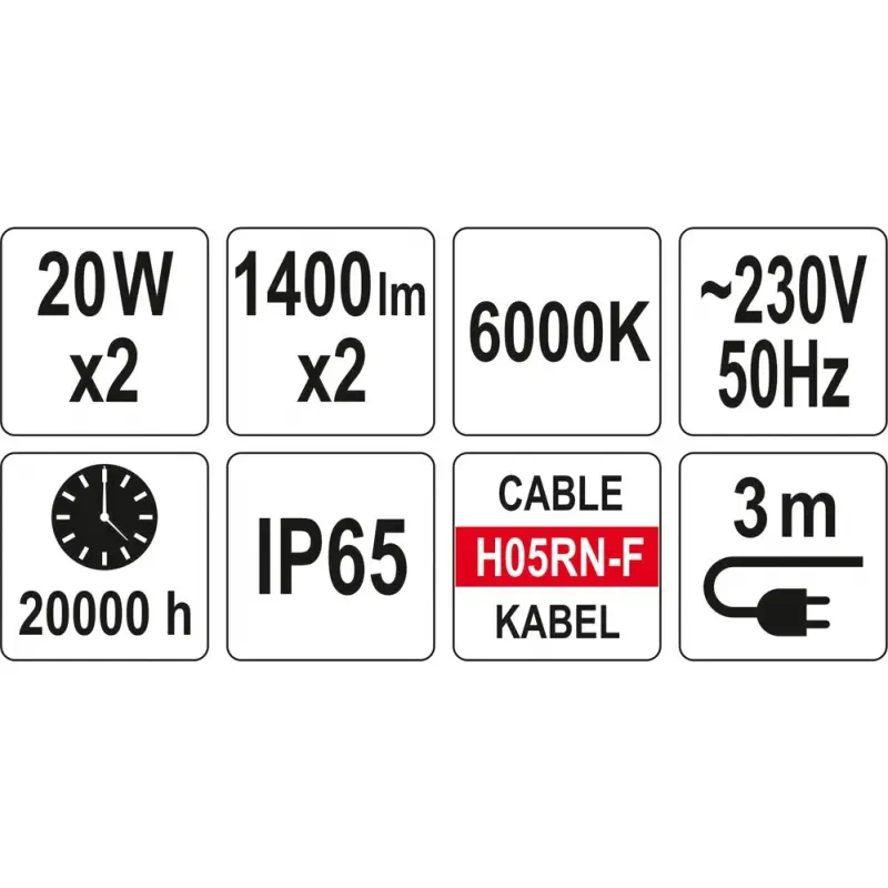 YT-81789 on professionaalne komplekt, millel on kaks kõrgtugeva lambiga prožektorit koos statiiviga. Tunnustatud Epistari kaubamärgi võimsad COB-dioodid tagavad suure valgustugevusega 2 x 1400 lm. LED-valgusallikas suurendab märkimisväärselt lambi vastupidavust võrreldes traditsiooniliste halogeenlampidega. See on palju vähem tundlik juhuslike mõjude ja mahaarvamiste suhtes, mis sageli esinevad töökojas või ehitusplatsil. Valgustitel on pulbervärvitud kindel alumiiniumkapsel, mis tagab LED-moodulile sobiva soojuse hajumise ning samal ajal pakub esteetilist välimust. Paks ja vastupidav klaas kaitseb dioodi välistest teguritest, reostusest ja mehaanilistest kahjustustest. Suur kaitse IP65 tagab kaitse tolmu ja vee sissetungimise eest. Stabiilne statiiv tagab kasutamise ohutuse ja võimaldab kõrguse reguleerimist (alates 0,7 m kuni 1,7 m) ja nurka, mille juures valgusvoog valgustab objekti. Valgustid on varustatud 3-millimeetrise kummist juhtmega, mis on ühendatud pistikuga.