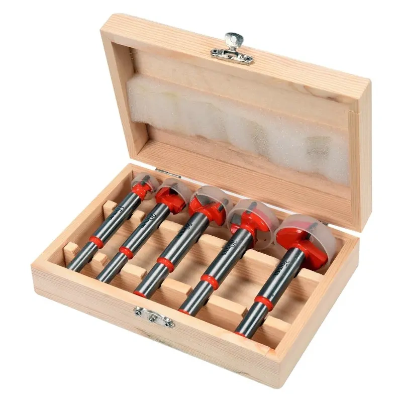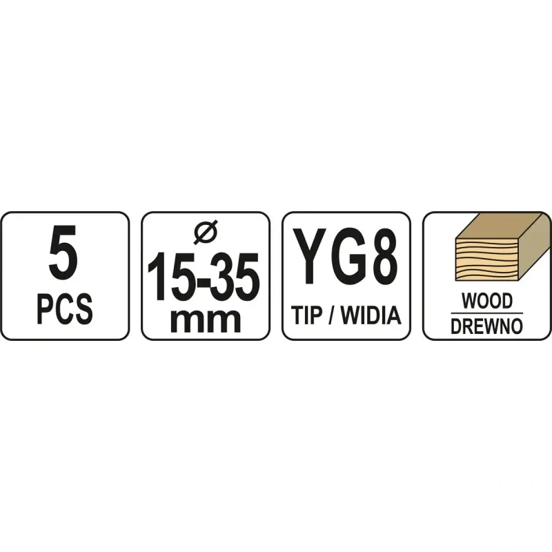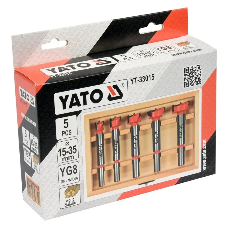 Puitpuuride komplekt hingede jaoks YATO YT-33015. Mõeldud täpsete aukude puurimiseks ilma servade tõmblemiseta pehmest puidust, vineerist, plastist. • valmistatud karastatud ja kvaliteetsest terasest; • YG8 terasest valmistatud widiad; • puurimine igas suunas.