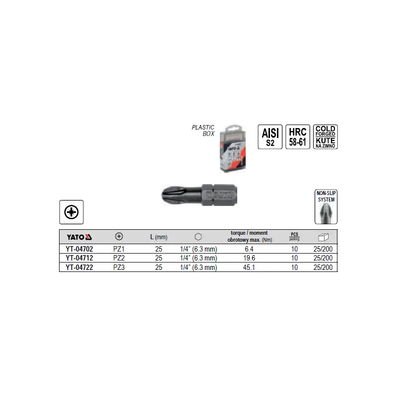Täppisnõuded kruvide või kruvide kruvimiseks. Profiil "pihustatud" jahvatatud, liivapritsiga viimistletud, kaitstud korrosioonikaitsega. Sepistatud külm teras S2. Lõpetatud NON SLIP SYSTEMi tehnoloogias, vähendades otsa libisemise võimalust kruvide küljel.