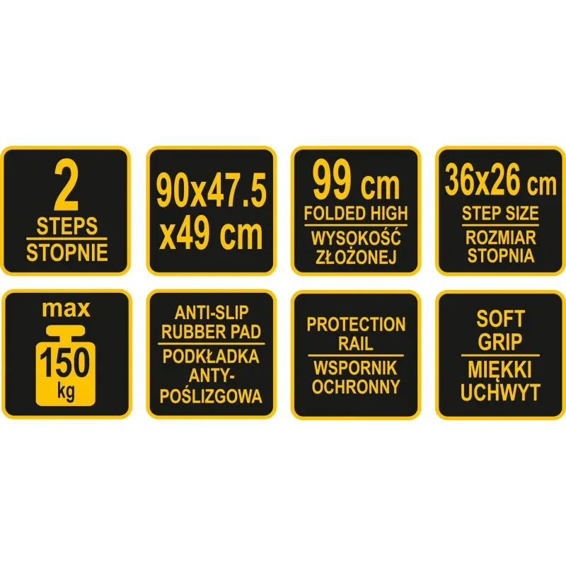 Redelil on 2 astet , mille mõõde on 36x26cm ja millel on lisaks libisemisvastased padjad. Tänu sellele võimaldab see kindlalt ja stabiilselt seista ilma libisemise või libisemise kartmata. Täiendav kaitseklamber redeli ülaosas koos pehme käsnaga kaitseb kukkumise eest ja on samal ajal väga mugav kaasas kanda.