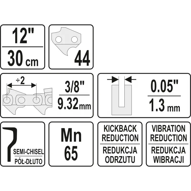 Pikkus 12 ", 44 lüli 3/8"samm, mille laius 0,05 "(1,3 mm) .