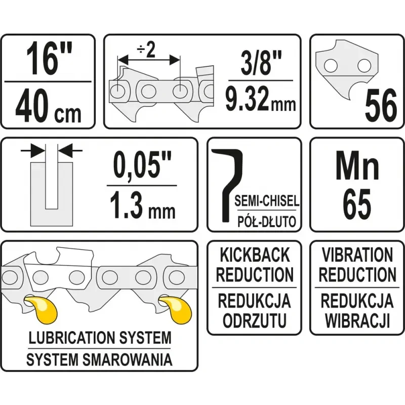 Lõikekett bensiini ja elektriliste kettsaagide jaoks. Pikkus 16 ", 56 lüli, kalle 3/8", laius 0,05 "(1,3 mm). Suure lõikekiirusega poolhaaval lõikehammas. See on mõeldud puhta ja keskmise määrdumisega puidu lõikamiseks. See on valmistatud terasest mangaan Mn65, mis tagab suurema purunemistugevuse, mis pikendab oluliselt