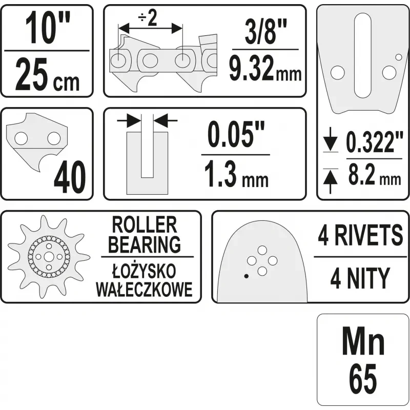 10 " pikkus , 40 lüli , 3/8 " samm , 0,05 "(1,3 mm) lai.
