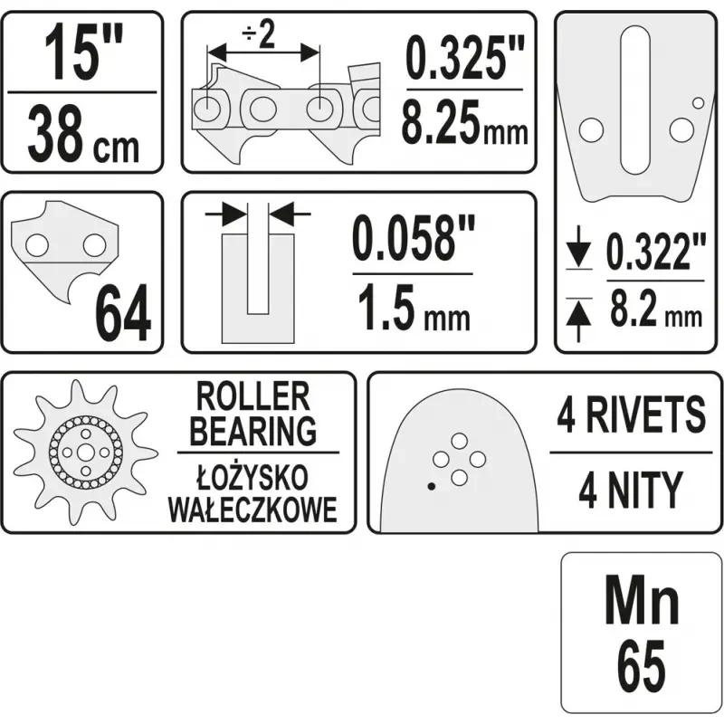 Keti juhend kettsaed. Pikkus on 15, "Cells 64, ulatuse 0,325" laius 0,058 "(1,5 mm). See on valmistatud mangaanterasest Mn65, mis suurendab märkimisväärselt hõõrdetaluvuse suunava ja ülekuumenemist, mis ulatub tema elu jooksul. Fantastiline ots on kinnitatud needid 4 pakkudes kõrgema paigaldus täpsuse ja tugevuse suurendamiseks juhend. Lisaks lõppu täht on rull-laager, mis tagab täpse juhtimise ahela, vähendades resistentsuse ajal.