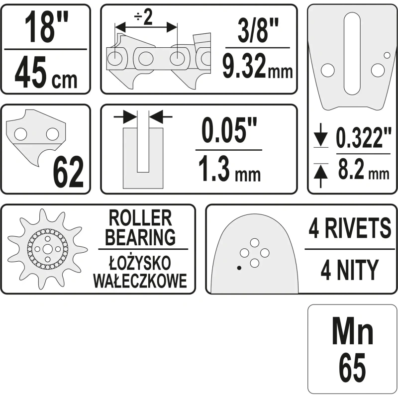 18 " pikkus , 62 lüli , 3/8 " samm , 0,05 "(1,3 mm) lai.