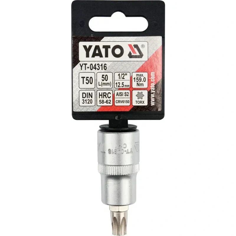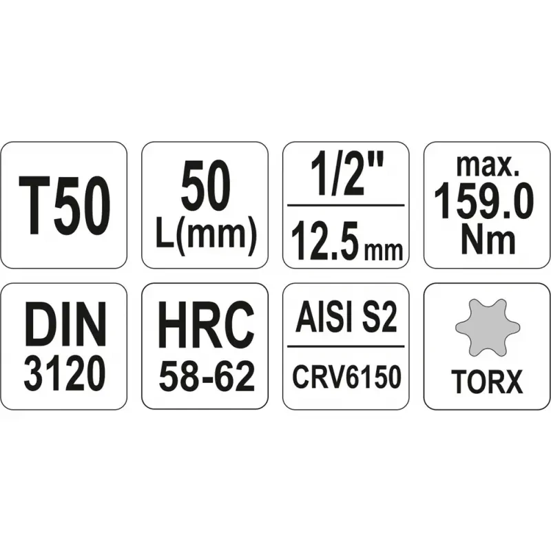 Professional kuuskantvõti. Torx suurus cap 1/2", varre suurus T50. Kork on valmistatud kroomitud terasest CrV6150, vars on valmistatud roostevabast terasest AISI S2 ja kihiga kaetud nikkel. Asendamatu vahend garaažis või mehaanikatöökojas.