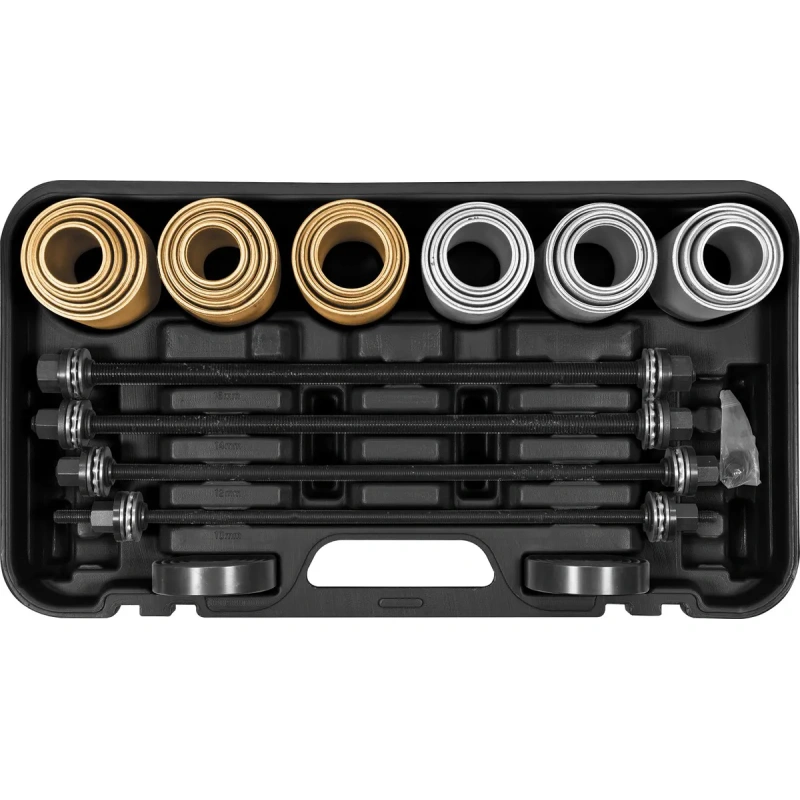 20 puksi komplekt metall-kummist pukside autole vahetamiseks/pressimiseks, ilma et oleks vaja õõtsh. või talasid lahti võtta. Komplekti kuulub 4 tõmbepolti ja kaks tsentreerimisplaati. Kõik praktilises kohvris.