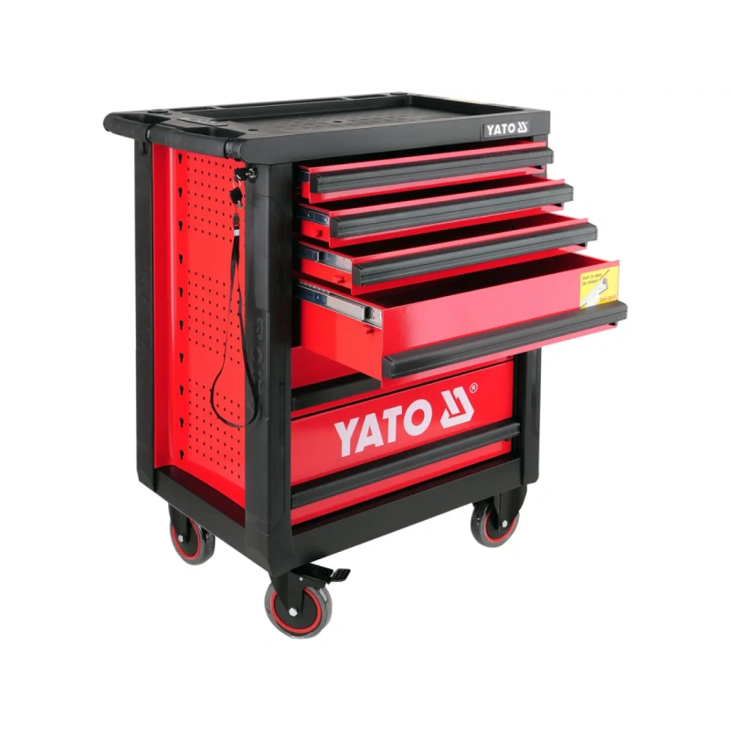 YATO tööriistade kapp YT-0902 on ideaalne lahendus auto töökohtadesse ja teenindusjaamadesse. Kapp, millel on 6 sahtlit pallõlidega, on valmistatud kahele erinevale teraslehele toetuvate profilide abil. Kapp pakub kesklukke ning iga sahtli puhul on individuaalne sulgemine. Kapp on varustatud nurkadega, mis kaitsevad juhusliku kahjustamise eest, näiteks auto kere kahjustumise eest. Ülemine pind on valmistatud polüpropüleenist, mille kandevõime on kuni 450 kg.