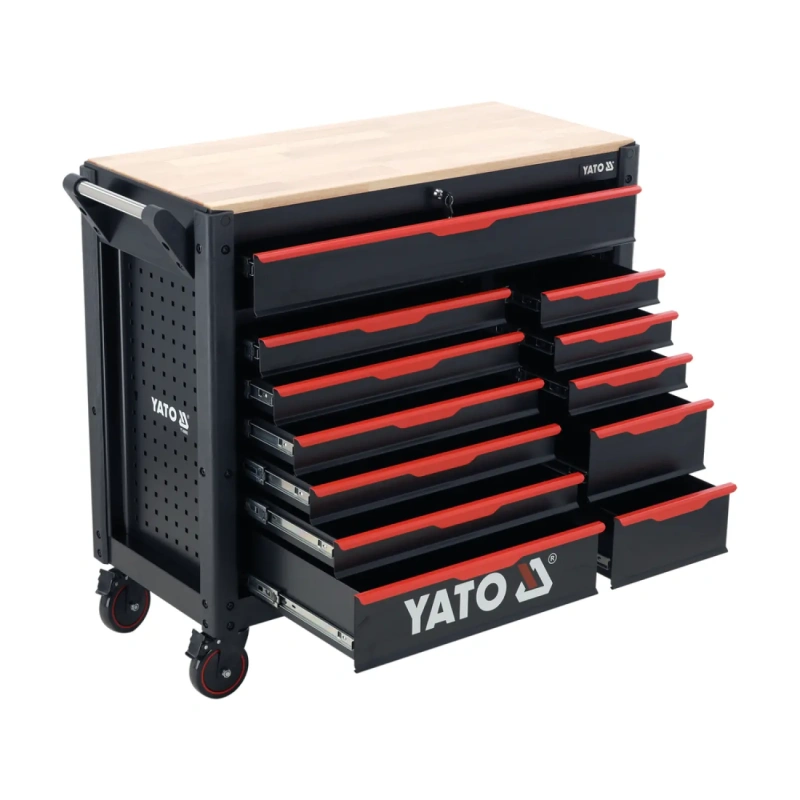 YATO tööriistakapp YT-09005 koos 12 sahtliga on ideaalne lahendus garaažides ja mootorsõidukite teenindusjaamades kasutamiseks. Kapi tööpind on valmistatud kummipuust, samas kui universaalne perforatsioon võimaldab lisamoodulite paigaldamist. Nurgakaitsjad aitavad kaitsta auto kere juhuslike kahjustuste eest.