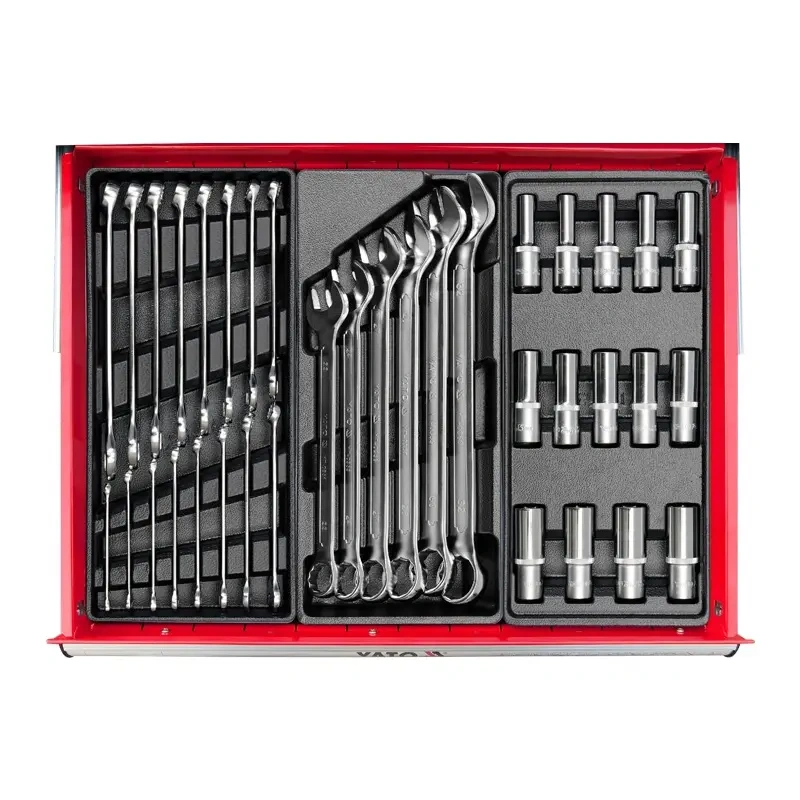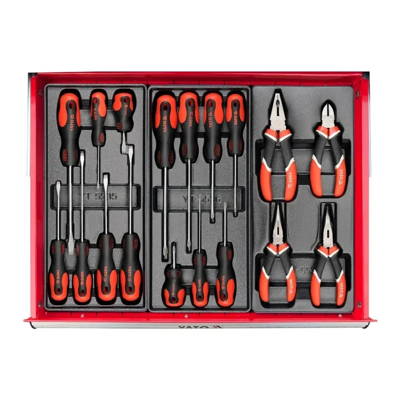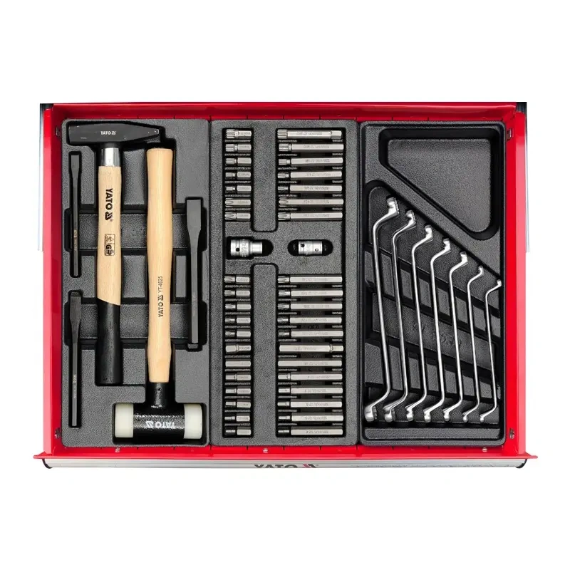 YATO brändi tööriistadega teeninduskapp. Sellel on kuus laagritega sahtlit. Kahekordse teraslehe profiilid. Kõigi sahtlite jaoks keskne lukustus ja individuaalne sulgemine. Töökoja kapis on nurgapallid, mis kaitsevad juhuslike kahjustuste eest, näiteks auto keha. Polüpropüleenist valmistatud laud talub koormat 430 kg. Autotöökodades ja sõidukite teenindusjaamades hädavajalik.