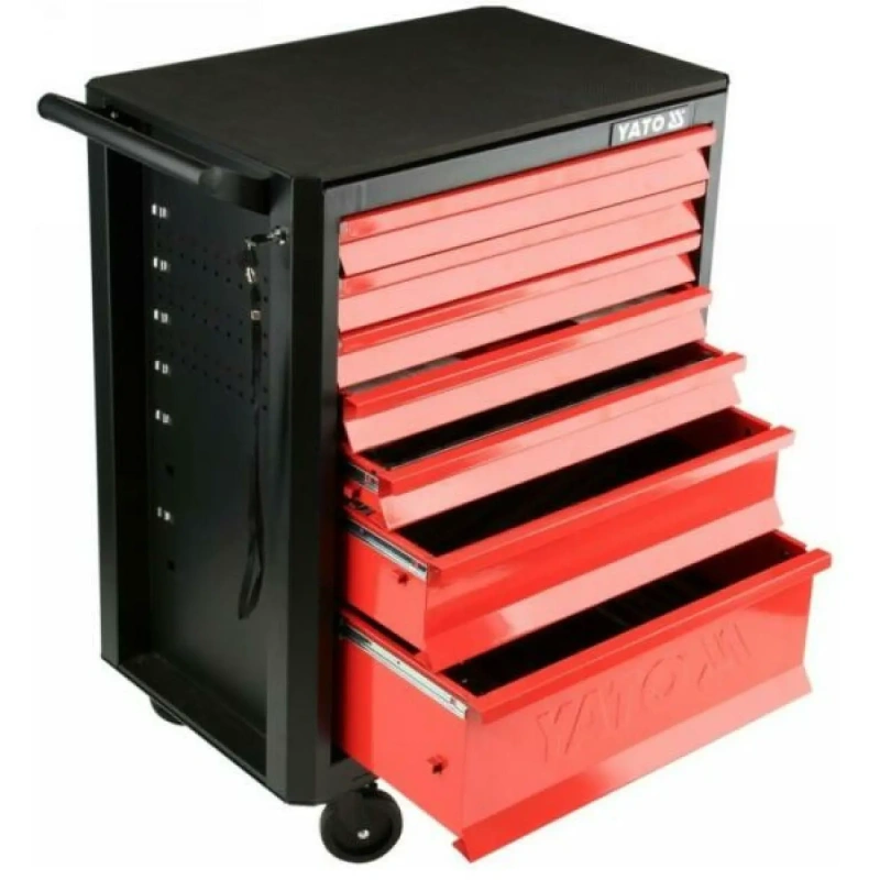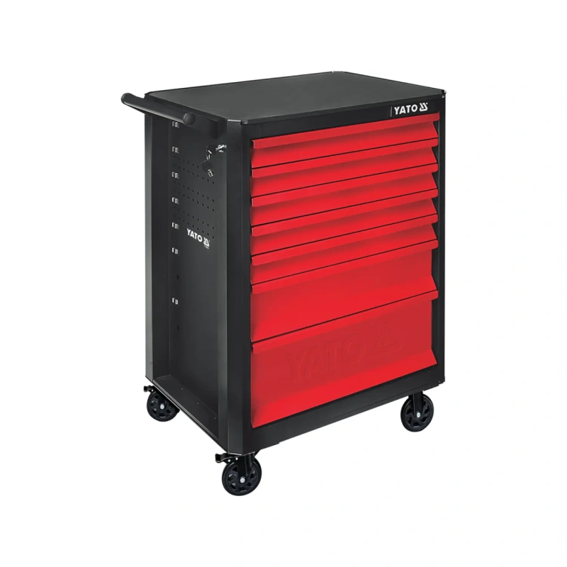 YATO YT-09000 on professionaalne tööriistakapp, mis on varustatud 7 sahtliga: 5 kitsast, üks keskmine ja üks suur. Kõik sahtlid on kindlustatud keskse lukuga. Kapp on varustatud pöörlevate ratastega, millel on pidurid, võimaldades mugavat kappide liigutamist. Ülemine pind on valmistatud tugevast metallist, mis on kaetud libisemisvastase vahtmaterjaliga – ülemise osa maksimaalne koormus on 210 kg. Kappide mõõtmed on 665 x 453 x 932 mm.