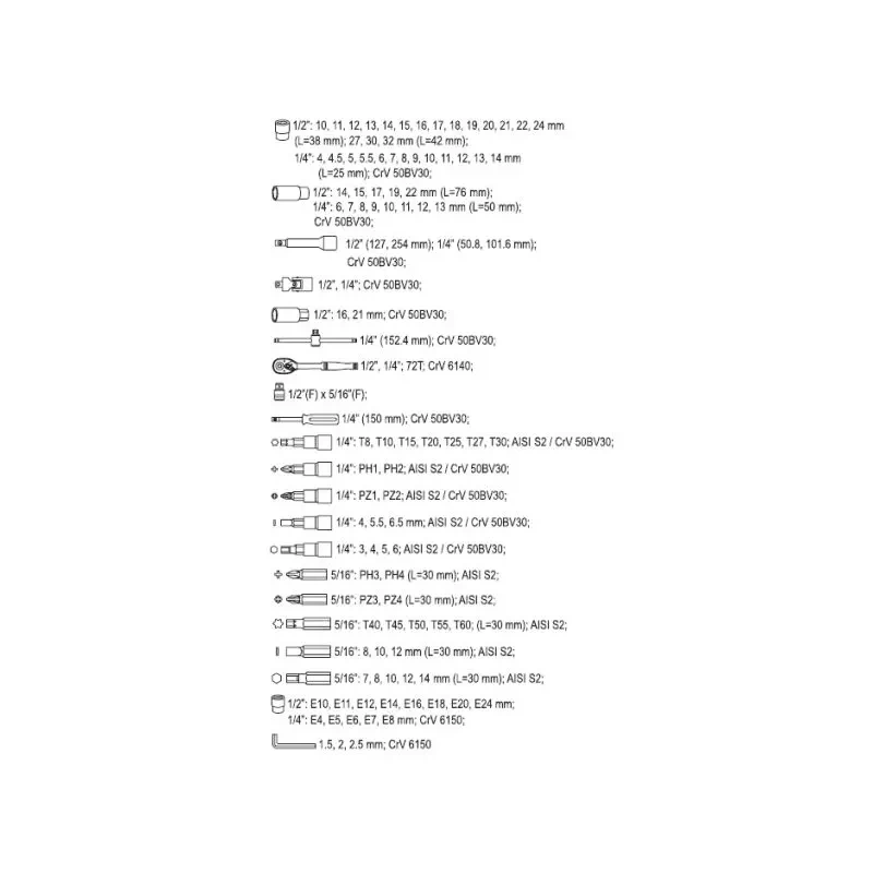 Professionaalne tööriistakomplekt, mis on välja töötatud spetsialiseeritud autode ja mehaaniliste teenuste vajaduste rahuldamiseks. Pesavõtmed ja pistikupesad on valmistatud tugevast tööriistast kroom-vanaadium CrV 50BV3. Mütsid valmistati suruga sepistamise teel ja enne kõvenemise protsessi kalibreeriti neid täppismõõturite ja kontrollseadmete abil. AS-Drive süsteemiga varustatud pistikupesad, maksimaalse pöördemomendi suurendamine 25% võrra, täismõõduliste kaitseribade äärtega, kahetoonilise pinnaviimistlusega korgid. Komplekt sisaldab ka kõvasid S2 terast. Seade võimaldab teha väga suure koormuse ja täpsusega tööd, mis võimaldab teostada mitmesuguste nimimahtude keermestatud ühenduste lahti keeramist ja kruvimist võimaldavaid teenuseid.