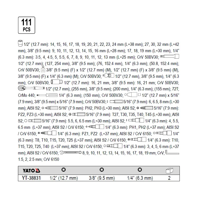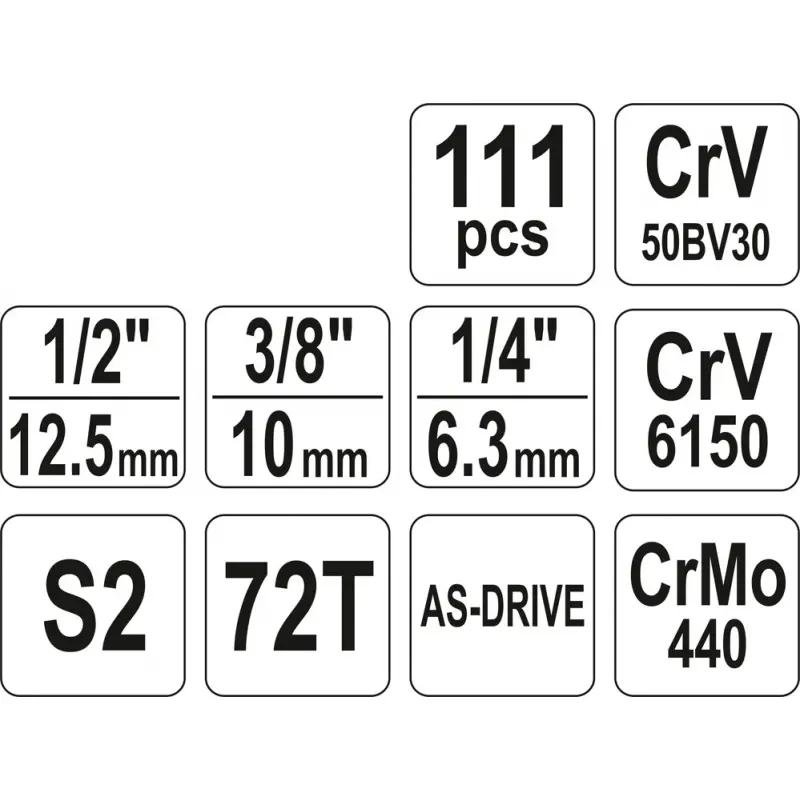 Tööriistakohver 111osa 1/4" 3/8" 1/2" YT-38831