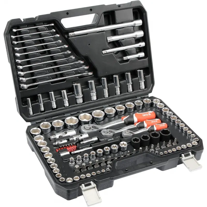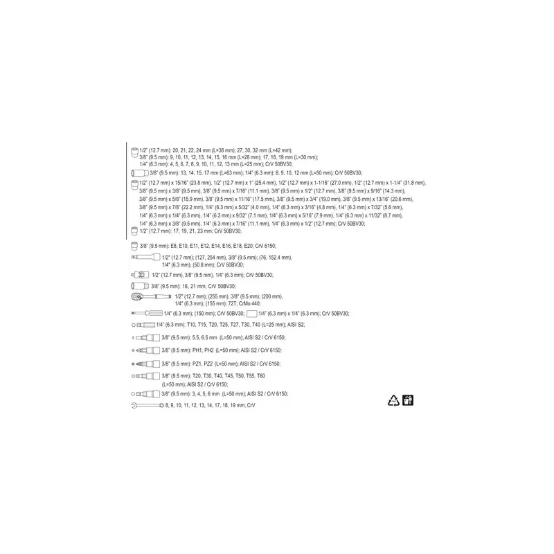 Professionaalne tööriistakomplekt, mis on välja töötatud spetsialiseeritud autode ja mehaaniliste teenuste vajaduste rahuldamiseks. Pesavõtmed ja pistikupesad on valmistatud vastupidavast tööriista terasest. Mütsid valmistati suruga sepistamise teel ja enne kõvenemise protsessi kalibreeriti neid täppismõõturite ja kontrollseadmete abil. AS-Drive süsteemiga varustatud pistikupesad, maksimaalse pöördemomendi suurendamine 25% võrra, täismõõduliste kaitseribade äärtega, kahetoonilise pinnaviimistlusega korgid. Komplekt sisaldab ka kõvasid S2 terast. Seade võimaldab teha väga suure koormuse ja täpsusega tööd, mis võimaldab teostada mitmesuguste nimimahtude keermestatud ühenduste lahti keeramist ja kruvimist võimaldavaid teenuseid.